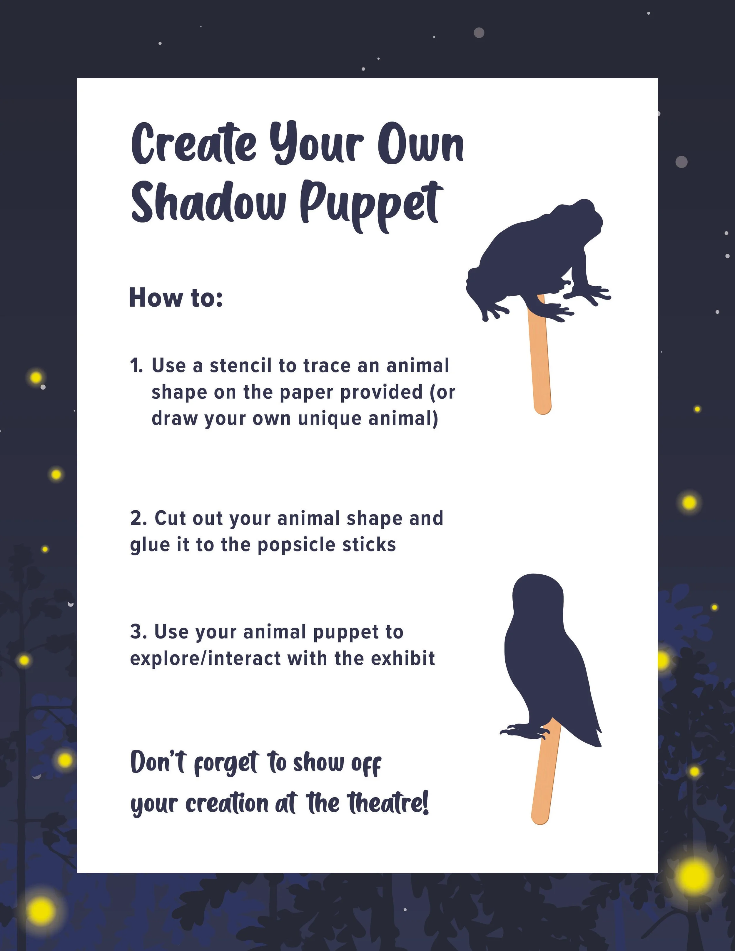 Since a majority of our demographic is children, we wanted to have another element that would appeal to them. In our initial spatial mock-up, we had a designated space for a shadow puppet area that kids could play in and experiment with the science of shadow puppetry. From the shadow-caster artwork, I made templates our users could trace onto card stock to make their own. Our team set up a whole area in the front of the exhibit where museum goers could make their own shadow puppets and other crafts to showcase at the theater.